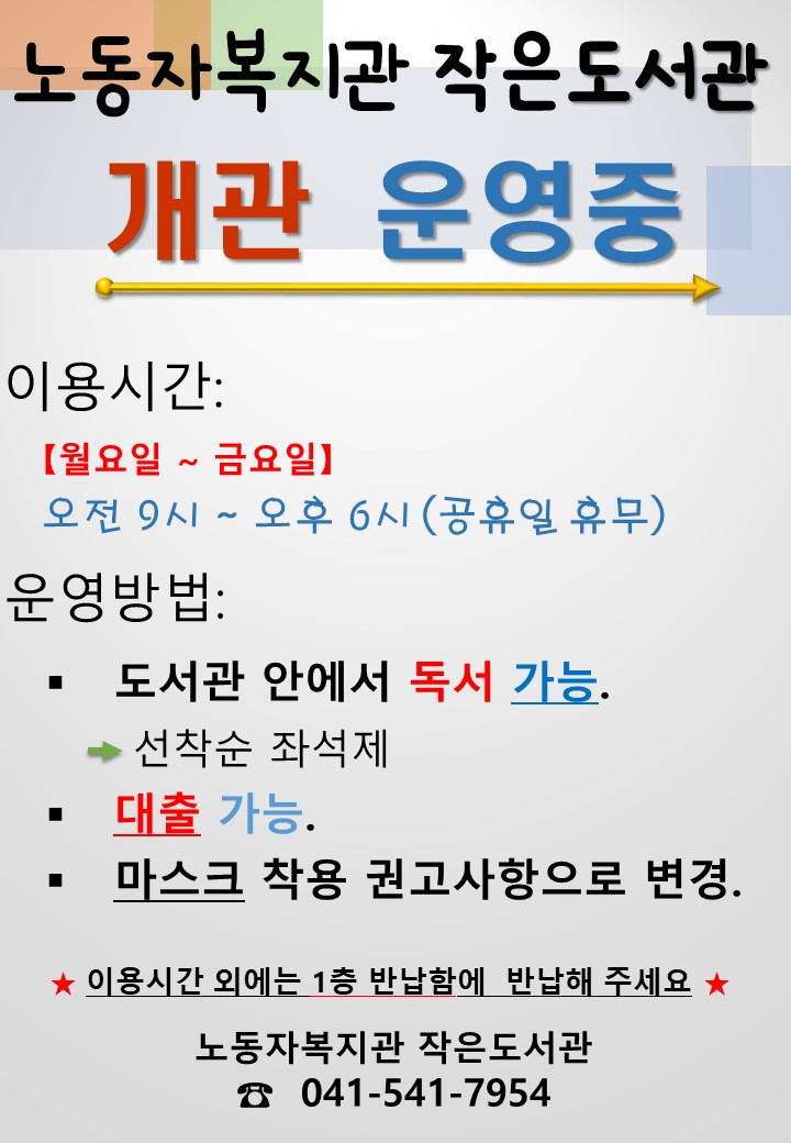 | 이전글▲ | 근로자복지관 작은도서관 재개관 안내 |