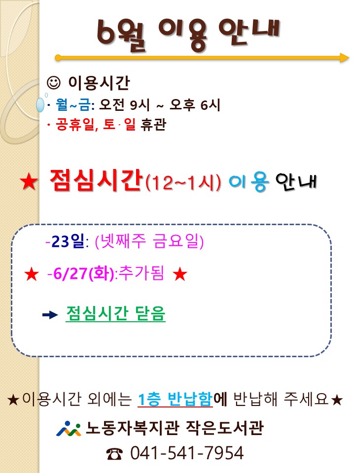 작은도서관 6월 이용안내(점심시간 휴무 공지-재변경)