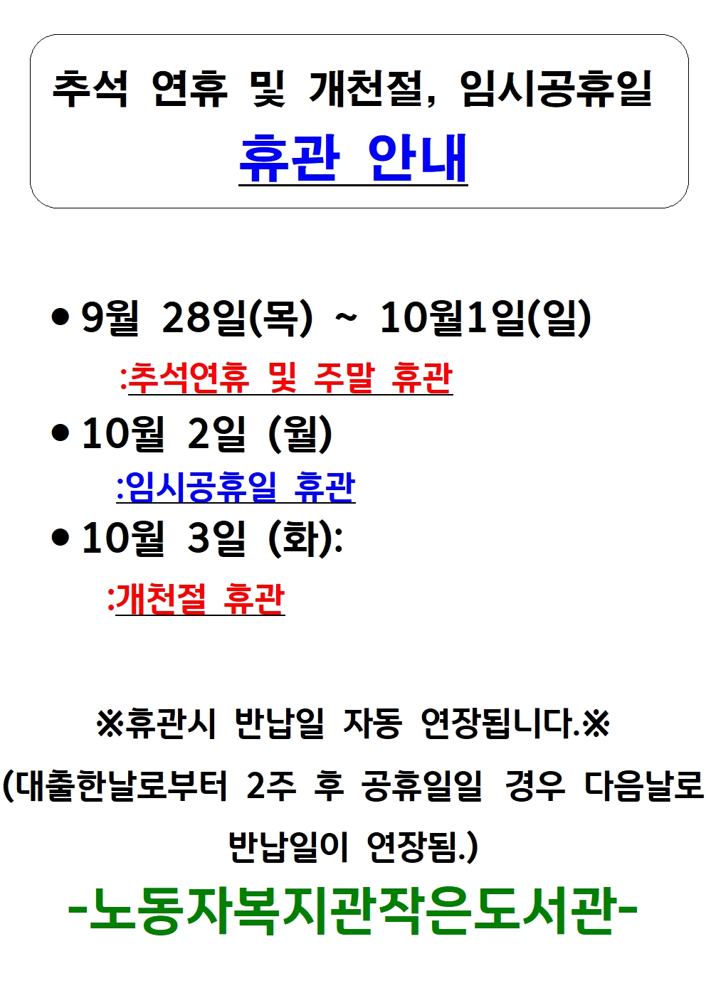 작은도서관 추석연휴 및 개천절, 임시공휴일 휴관 안내