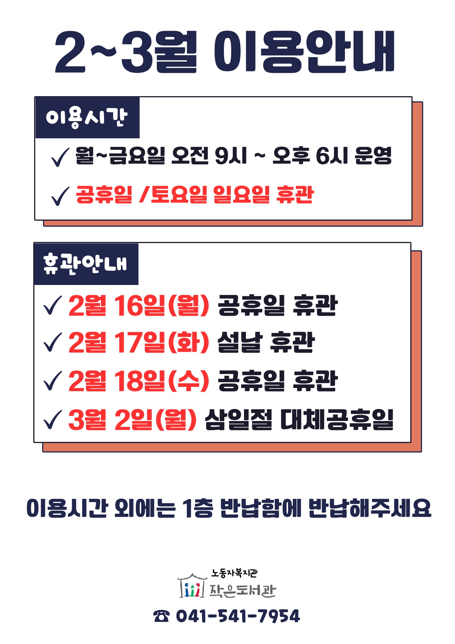 노동자복지관 작은도서관 2~3월 휴관 안내